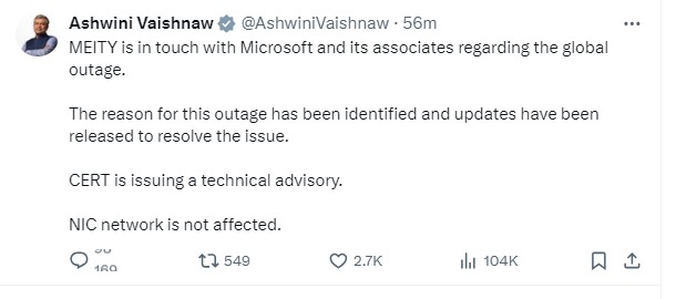 राष्ट्रीय सूचना विज्ञान केंद्र, आउटेज के संबंध में Microsoft और उसके सहयोगियों के संपर्क में है। इस आउटेज के कारण की पहचान कर ली गई है और समस्या के समाधान के लिए अपडेट जारी कर दिए गए हैं। Indian Computer Emergency Response Team एक एडवाइजरी जारी कर रहा है.