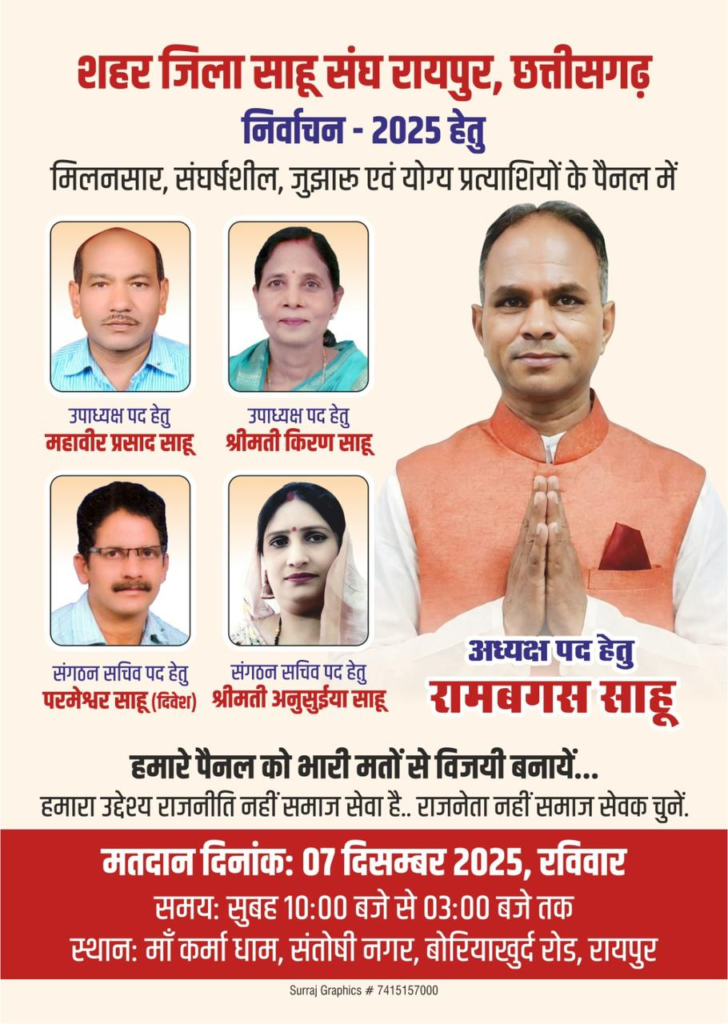 रायपुर, 06 दिसंबर। City District Sahu Sangh : जय कर्मा माता के उद्घोष के साथ शहर जिला साहू संघ रायपुर के आगामी चुनाव को लेकर समाज में सक्रियता बढ़ गई है। जिला अध्यक्ष पद के उम्मीदवार रामबगस साहू और उनके पूरे पैनल ने 7 दिसंबर को होने वाले चुनाव में समाजजनों से समर्थन और सहयोग की अपील की है।