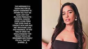 दुःख की इस घड़ी में, हम प्राइवेसी की रिक्वेस्ट करेंगे, हम उन्हें हमारे द्वारा शेयर की गई हर बात के लिए प्रेमपूर्वक याद करेंगे.’ निधन की खबर के बाद पूनम के फैंस उन्हें सोशल मीडिया में श्रध्दांजलि दे रहे है. बता दे कि सोशल मीडिया प्लेटफॉर्म में पूनम के फॉलोवर्स मीलियन में है. मीडिया रिपोर्ट के मुताबिक उनकी मौत उनके उत्तर प्रदेश में अपने घर में हुई है, एक्ट्रेस की के निधन की खबर से सब हैरान हैं क्योंकि कुछ दिन पहले ही पूनम को इवेंट्स में देखा गया था और उसने सोशल मीडिया पर अपडेट भी शेयर किया था.