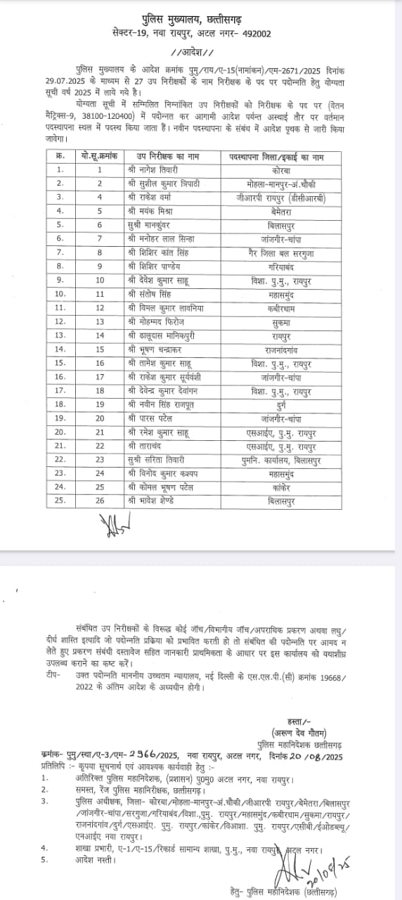 रायपुर। CG Breaking: छत्तीसगढ़ पुलिस मुख्यालय से एक महत्वपूर्ण आदेश जारी करते हुए 27 उप निरीक्षकों (SI) को निरीक्षक (Inspector) पद पर अस्थायी रूप से पदोन्नति दी गई है। यह आदेश पुलिस विभाग में पदोन्नति की प्रक्रिया के तहत जारी किया गया है।