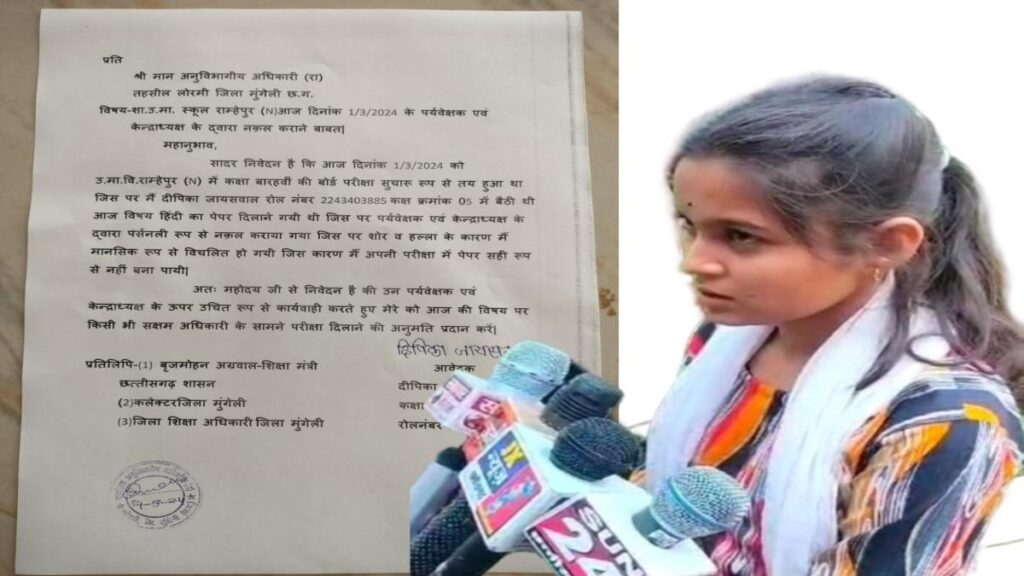 मुंगेली। मिली जानकारी के अनुसार जिले के एक सरकारी स्कूल में आयोजित किए गए 12वीं बोर्ड की परीक्षा में पर्यवेक्षक और केंद्र अध्यक्ष की ओर से नकल कराने का मामला सामने आया है। एक छात्रा दीपिका जायसवाल ने परीक्षा के दौरान लोरमी SDM लिखित में शिकायत करके जानकरी दी है।