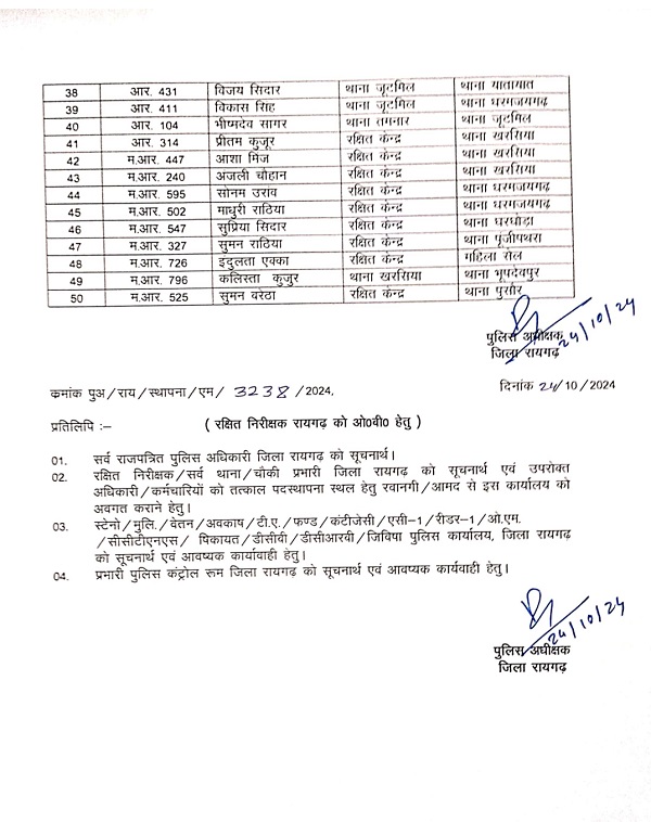 रायगढ़। छत्तीसगढ़ के रायगढ़ जिले में एक बार फिर से बड़ी संख्या में पुलिसकर्मियों का तबादला किया गया है। इस बार 50 पुलिसकर्मियों को इधर से उधर ट्रांसफर किया गया है। इस संबंध में एसपी दिव्यांग पटेल ने आदेश जारी किए हैं। देखिए आदेश की कॉपी….