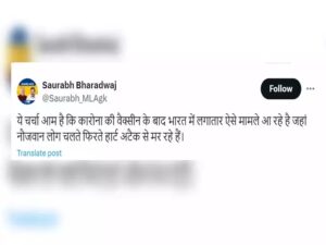 रामलीला के बीच कलाकार की हार्ट अटैक से मौत होने पर दिल्ली के स्वास्थ्य मंत्री सौरभ भारद्वाज ने कोरोना वैक्सीन पर सवाल उठाया है। उन्होंने ट्वीट करते हुए लिखा कि ये चर्चा आम है कि कोरोना की वैक्सीन के बाद भारत में लगातार ऐसे मामले आ रहे है जहां नौजवान लोग चलते फिरते हार्ट अटैक से मर रहे हैं।