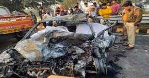 मथुरा। यूपी के मथुरा में यमुना एक्सप्रेस-वे में सोमवार की सुबह भीषण हादसे का शिकार हो गई। टायर फटने से प्राइवेट वॉल्वो बस तिरछी होकर खड़ी हो गई। इतने में पीछे से आ रही तेज़ रफ़्तार की स्विफ्ट कार इस बस से आकर टकरा गई। इस हादसे से तेज धमाका हुआ और दोनों गाड़ियों में आग लग गई।