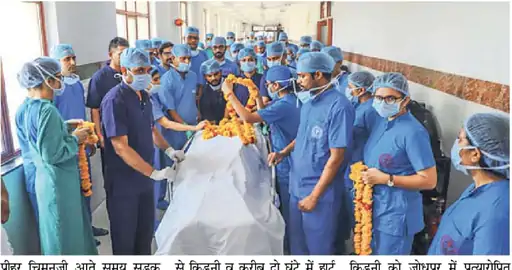 जोधपुर एम्स से रविवार को ग्रीन कॉरिडोर बनाकर सुबह 11:10 बजे फ्लाइट के जरिए हार्ट को और सड़क मार्ग से एक किडनी को जयपुर के एसएमएस हॉस्पिटल के लिए भेजा गया। वहीं एक किडनी और लीवर को एम्स अस्पताल में एक ही मरीज को प्रत्यारोपित किया गया। अंग डोनेट करने के निर्णय के बाद एम्स चौकी इंचार्ज धनाराम के नेतृत्व में अस्पताल में पुलिसकर्मियों की टीम तैनात रही। एम्स के बाहर बासनी एसआई सुरेश कुमार के नेतृत्व में टीम ने ग्रीन कॉरिडोर बनाया।
