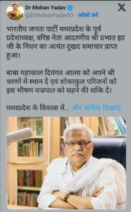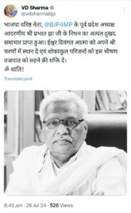 तो वही उनके निधन पर बीजेपी प्रदेश अध्यक्ष वीडी शर्मा ने शोक प्रकट की। उन्होंने कहा, ‘बीजेपी के पूर्व प्रदेश अध्यक्ष प्रभात झा के निधन का अत्यंत दुखद समाचार प्राप्त हुआ। ईश्वर दिवंगत आत्मा को अपने श्री चरणों में स्थान दें एवं शोकाकुल परिजनों को इस भीषण वज्रपात को सहने की शक्ति दें। ॐ शांति’