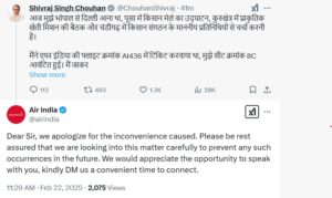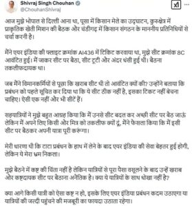 शिवराज सिंह चौहान ने भोपाल से दिल्ली की यात्रा के दौरान टूटी हुई सीट मिलने पर नाराजगी जताई थी और एयर इंडिया की सेवाओं पर सवाल उठाए थे। उनकी शिकायत के बाद एयर इंडिया ने प्रतिक्रिया देते हुए आश्वासन दिया कि इस तरह की असुविधाओं को दोबारा न होने देने के लिए उचित कदम उठाए जाएंगे।